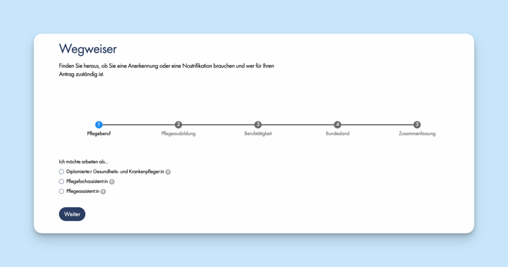Zudem gibt es ein hilfreiches Tool, (Wegweiser) der die zuständigen Stellen ausfindig macht, bei denen ein Antrag auf Anerkennung gestellt werden kann.